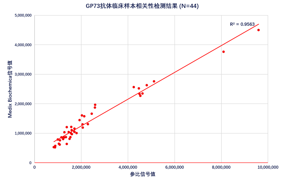 圖:Medix Biochemica的GP73抗體,在吖啶酯化學(xué)發(fā)光平臺(tái)測(cè)試,臨床相關(guān)性為R²=0.9563。